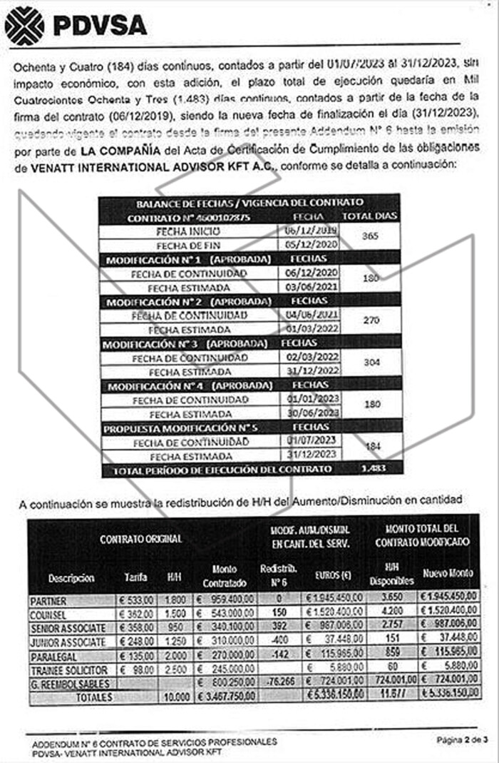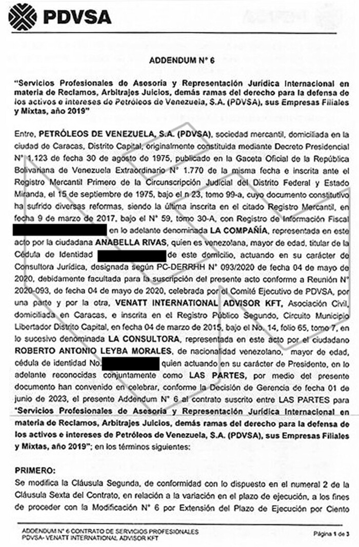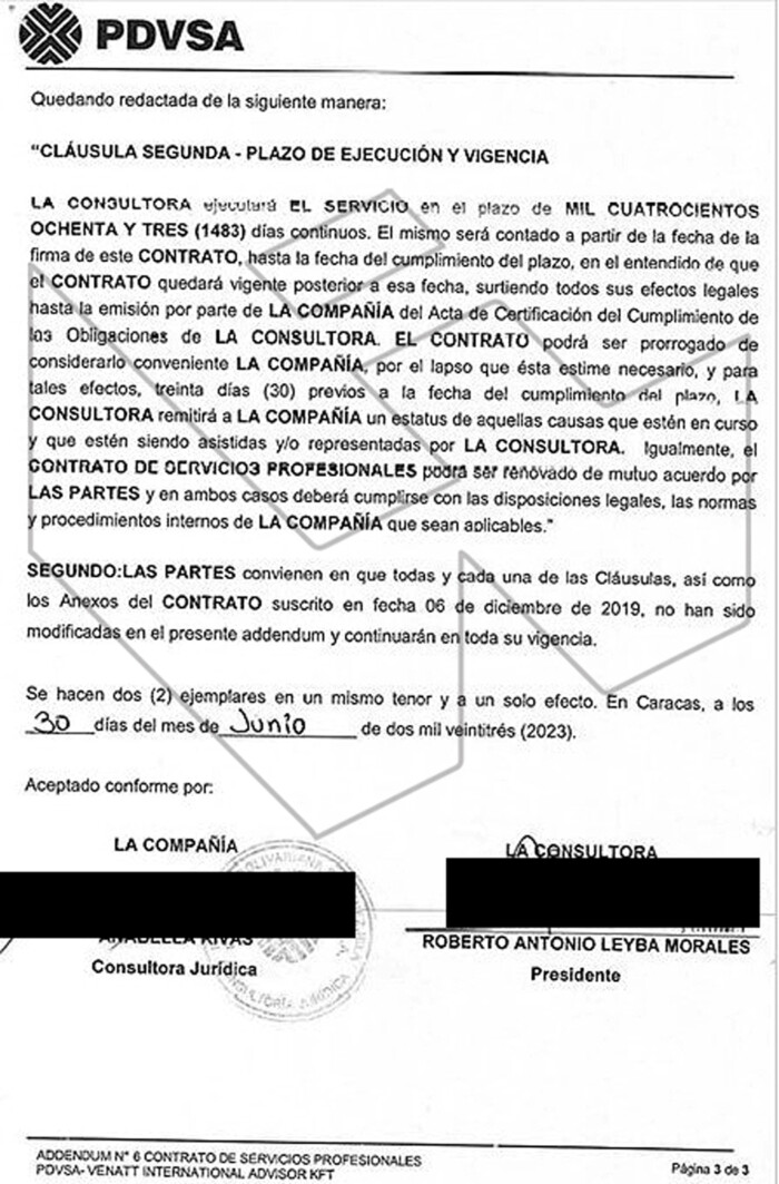 Estos documentos son contratos, con sus respectivas addenda, desde el año 2019. Desde entonces, siempre se rubrican por el mismo Leyba y por Anabella del Valle Rivas de Trejo, abogada y consultora jurídica de la Oficina Nacional de Crédito Público (ONCP). Desde el 29 de abril de 2020 Rivas se desempeña como consultora jurídica de Pdvsa.