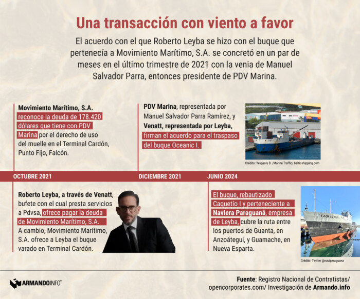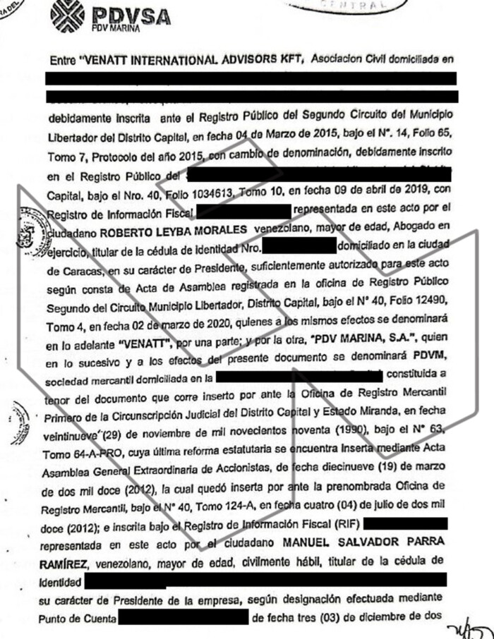 La víspera del año viejo de 2021, el acuerdo lo suscribieron un teniente coronel de la Guardia Nacional Bolivariana (GNB), Manuel Salvador Parra Ramírez, en su rol de presidente de PDV Marina, y el mismo Leyba, como representante de Venatt International Advisors KFT.