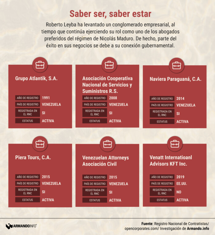 Leyba ha combinado, con fluidez y sin resquemores, el derecho y los negocios. Parte de estos últimos se han inclinado a la prestación de servicios al Estado venezolano. Pero, sin dudas, ha sido Venatt, fundada en 2015 como Venezuelan Attorneys Asociación Civil, la que le ha dejado más réditos a partir de sus contratos con el gobierno.