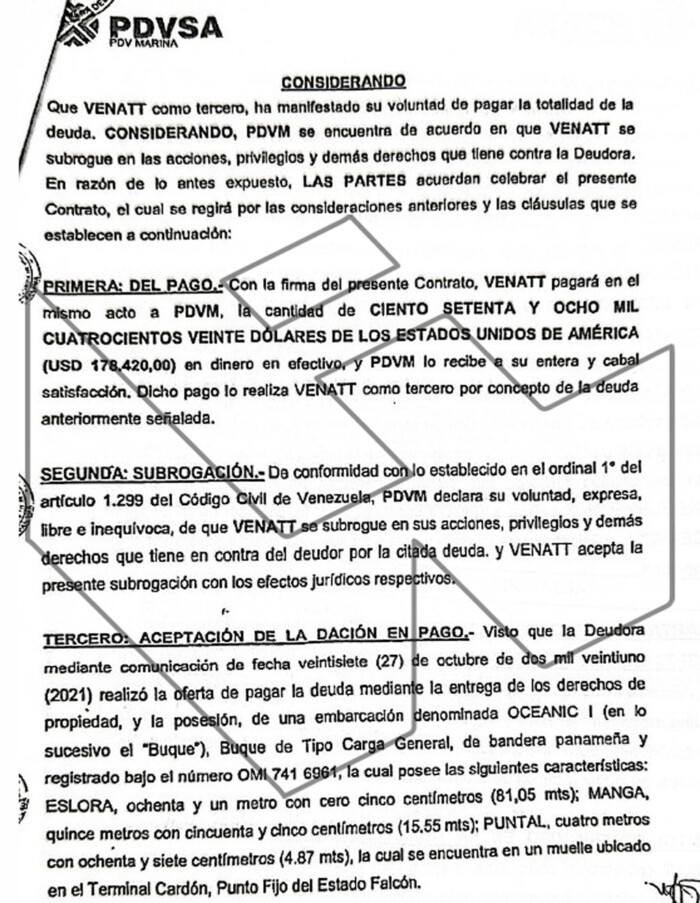 Con la deuda reconocida y con PDV Marina tocándole a la puerta, a Movimiento Marítimo, S.A. no le quedó más alternativa que aceptar su insolvencia. Pero antes que declarar el impago, consiguió la opción de Roberto Leyba: mediante la figura de una subrogación, la firma Venatt International Advisors ofrecía desde Estados Unidos cancelar la totalidad de la deuda. Como prenda, Movimiento Marítimo, S.A., la deudora original, entregaría a Venatt un buque, convenientemente ya amarrado en uno de los muelles pertenecientes a Pdvsa en el Terminal Cardón, en Punto Fijo, estado Falcón.
