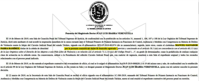El Tribunal Primero de Primera Instancia en Funciones de Control, Audiencia y Medidas con Competencia en Materia de Delitos de Violencia contra la Mujer del Circuito Judicial Penal del estado Táchira llevó el caso y dictó contra Parra Ramírez una medida privativa de libertad. Pero esta no se cumplió: el 27 de junio de 2019, mediante una decisión firmada por Maikel Moreno, presidente entonces del Tribunal Supremo de Justicia (TSJ), se sustrajo del juzgado regional la causa seguida contra Parra Ramírez para engavetarla en Caracas. Desde entonces, en ese tiempo agregado de libertad que no concluye, el teniente coronel continuó ocupando cargos públicos, incluyendo los de miembro del anillo presidencial de Nicolás Maduro y de presidente de PDV Marina. Hasta septiembre de 2023 ocupó el cargo de comandante del Destacamento de Comandos Rurales 43-1 de la GNB en el estado Miranda, centro-norte de Venezuela.