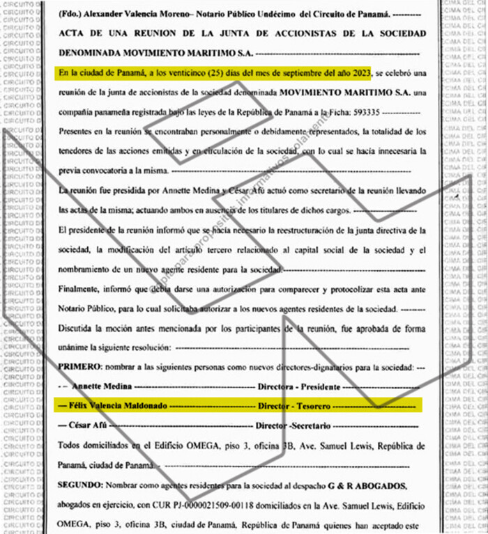 Aún en septiembre de 2023, Valencia Maldonado era miembro de Movimiento Marítimo, S.A.