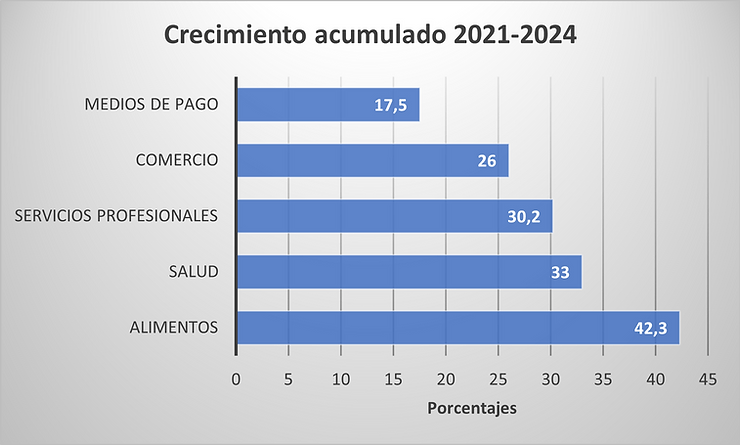De acuerdo con Ecoanalítica, si se incluyen las proyecciones para este año el crecimiento tras el fin de la pandemia, en el lapso 2021-2024, se concentra en alimentos, salud principalmente por la elaboración de medicamentos, servicios profesionales, comercio y medios de pago.