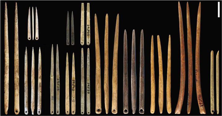 Algunas de las primeras agujas de coser, de variadas formas y tamaños, procedentes de varios yacimientos de Eurasia.