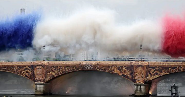 Una explosión de humo con los colores azul, blanco y rojo de la bandera francesa, en la inauguración de los Juegos Olímpicos Paris 2024 el viernes (26.07.2024).