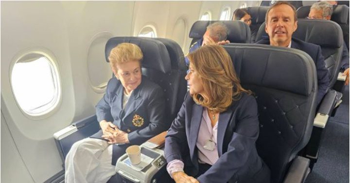 Los exmandatarios decidieron no bajar del avión, desafiando la orden de las autoridades venezolanas, lo que provocó el retraso de otros vuelos hacia Venezuela, según informes de prensa local. Mireya Moscoso y Martha Lucía Ramírez, adelante; Jorge Quiroga, atrás a la derecha.
