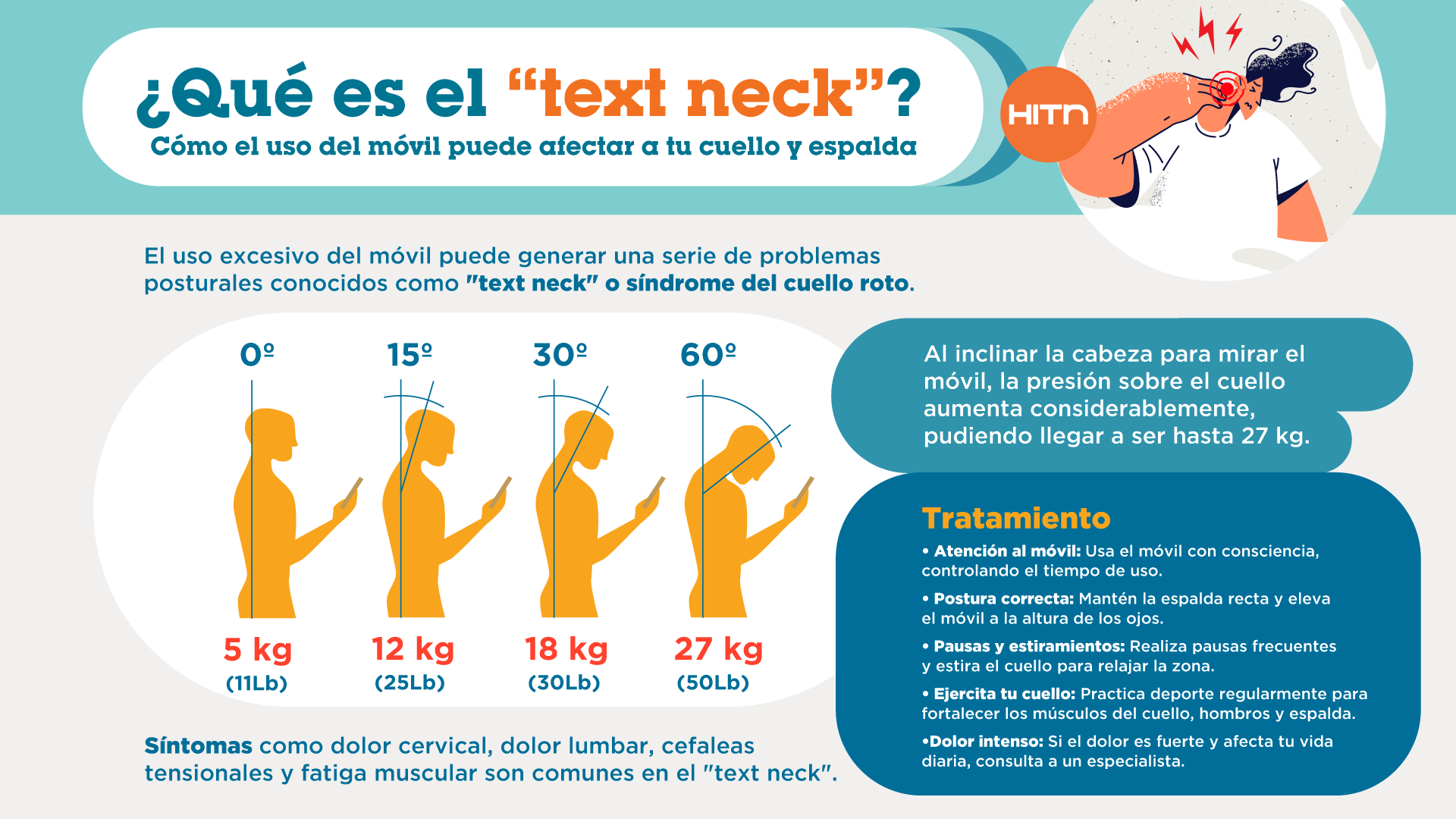 Todo esto ha hecho que también surjan dudas sobre el impacto que esto puede tener sobre nuestra salud. Se ha investigado cómo el uso de las pantallas puede afectar a nuestra vista o cómo puede afectar a nuestro desarrollo el uso de estas tecnologías. Ya se está hablando de cómo las redes sociales y estos dispositivos pueden acabar generando adicciones. Pero otro efecto quizás menos conocido es el que puede ocasionarnos graves lesiones por pasarnos muchas horas mirando sus pantallas, algo que se conoce como el síndrome text neck o síndrome del cuello roto, que fue descrito por primera vez en 2008 por el quiropráctico Dean L. Fishman.