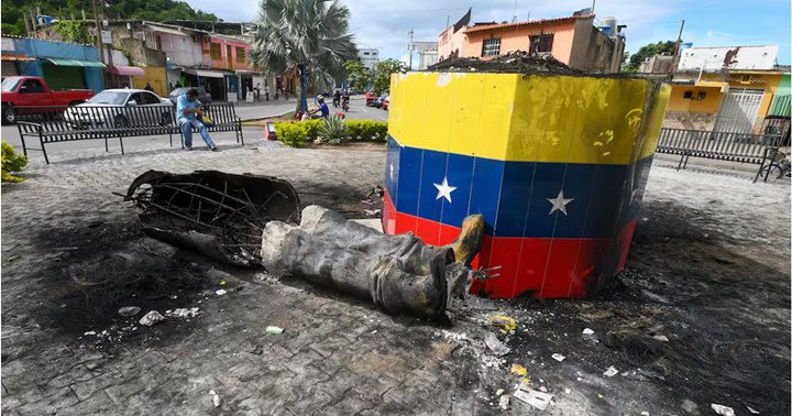 El derribamiento de cinco estatuas es un símbolo de que el madurismo ya no rinde tributo al padre fundador del chavismo en Venezuela. Una estatua destruida de Hugo Chávez en Valencia (Venezuela) el 30 de julio de 2024.