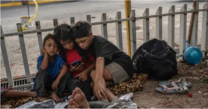 Los niños Bolaños (de izquierda a derecha) Sebastián, Kamila y Miguel Ángel, de Venezuela, miran un teléfono móvil afuera de la terminal de autobuses donde viven con su madre Keilly y otro hermano, junto con otros migrantes en Villahermosa, México, el 8 de junio de 2024.
