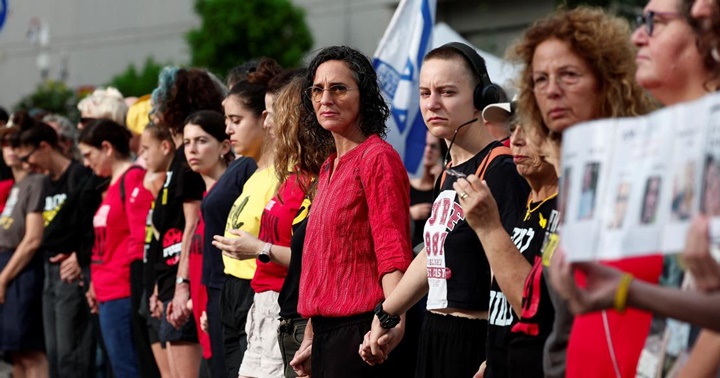 También en la ciudad de Tel Aviv, familiares de rehenes y simpatizantes se concentraron antes del amanecer para pedir el regreso de sus seres queridos, portando pancartas y carteles con sus fotografías.