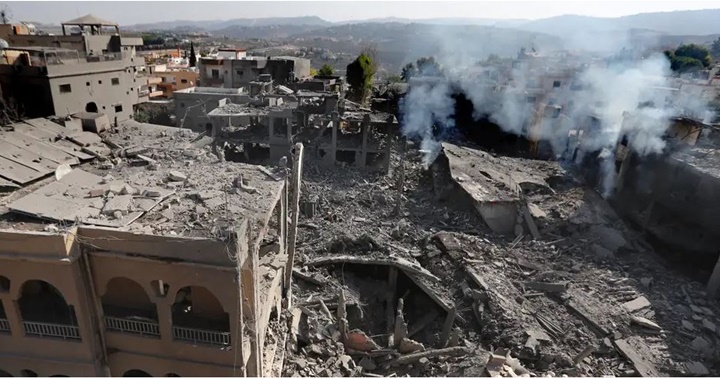 El Ejército israelí bombardeó un suburbio del sur de Beirut, bastión de Hezbolá, y una ciudad del sur del país, luego de que el primer ministro israelí afirmara que se opone a un alto al fuego unilateral en Líbano. Edificios destruidos por ataques aéreos israelíes en la aldea de Qana, en el sur del Líbano, este miércoles 16 de octubre de 2024.