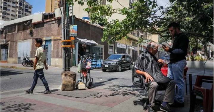 Un barbero realiza un corte en las calles de Caracas Venezuela.