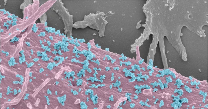 El descubrimiento podría facilitar el diagnóstico precoz del cáncer y mejorar el tratamiento de algunos problemas de salud, como la diabetes y los niveles altos de colesterol. Una célula humana (rosa) libera exosomas (azules), en una imagen tomada con un microscopio electrónico de barrido.