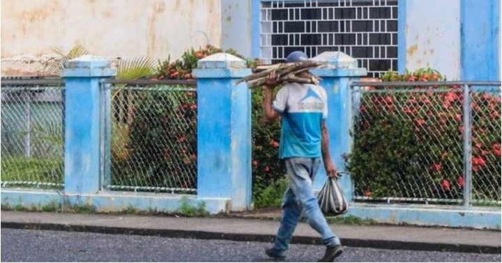 Un hombre carga leñas sobre su hombro por la calle Manamo de Tucupita.
