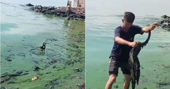 Asimismo, en el audiovisual, se observa cómo un grupo de trabajadores retiran, rescatan a dos garzas blancas cubiertas de petróleo. La triste escena muestra a las dos aves totalmente inmovilizadas cerca de la orilla, situación que obligó a los pescadores a tomar acciones para sacar del agua a los animales.