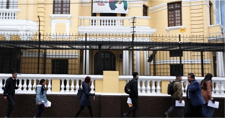 Un grupo de venezolanos marchan a la embajada de su país en Perú para regularizar su situación migratoria.