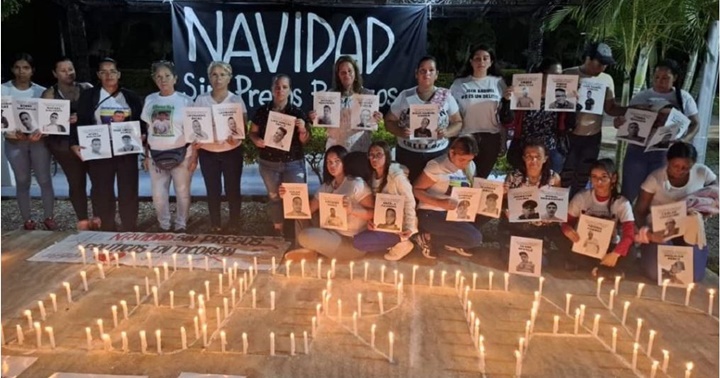 Los manifestantes, que tenían papeles con los rostros y nombres de detenidos, encendieron decenas de velas blancas con las que formaron en el piso la palabra ‘libertad’, y también pusieron carteles con mensajes como “Navidad sin presos políticos en Tocorón”.