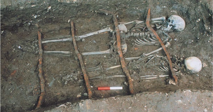El análisis de los huesos de centenares de londinenses medievales contradice la paradoja actual en la que las féminas enferman más pero tienen mayor esperanza de vida. Doble enterramiento en el cementerio de Guildhall Yard, en Londres, datado en el siglo XII.