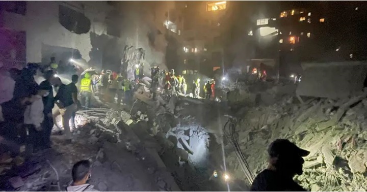 Según el canal de televisión Al-Manar, el ataque destruyó por completo un edificio de ocho pisos y dejó un cráter de enormes proporciones.