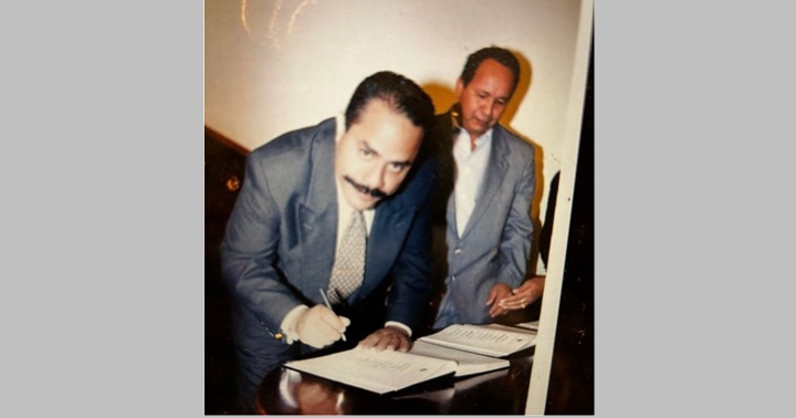 En la gráfica de hace un cuarto de siglo estoy firmando la Constitución aprobada por el soberano. Me acompaña el constituyente Liborio Guarulla, del Estado Amazonas.