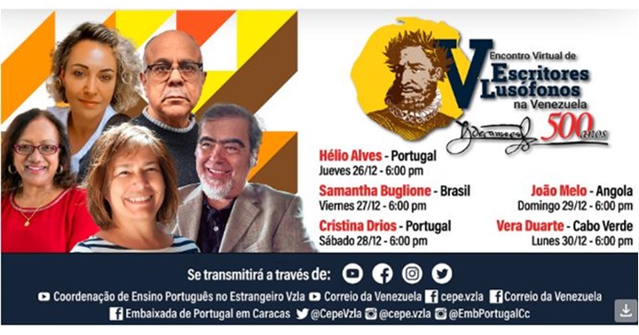 El V Encuentro Virtual de Escritores Lusófonos tendrá lugar entre los días 26 y 30 de diciembre, a las 06:00 pm (hora venezolana), en los canales de YouTube de la Coordinación de la Enseñanza Portuguesa en el Extranjero (Cepe Vzla) y del Correo Venezolano; así como en sus cuentas de Instagram y Facebook.