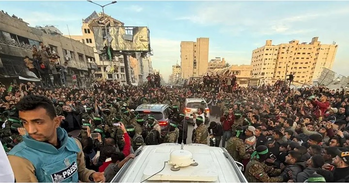 Ciudadanos palestinos y miembros de Hamás se reúnen alrededor de un vehículo de la Cruz Roja antes de la liberación de los rehenes (19.01.2025)
