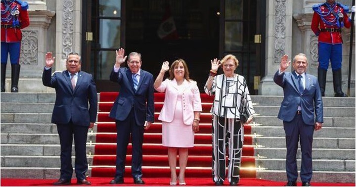 Adrianzén y Boluarte ayudaron a González Urrutia a subir las escaleras que dan acceso al Palacio de Gobierno y se hicieron las fotos protocolarias en el Salón de Embajadores, antes de comenzar su reunión en privado.