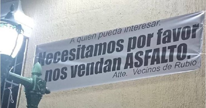 Una pancarta con el mensaje: A quien pueda interesar. Necesitamos por favor nos vendan asfalto. Atte. Vecinos de Rubio, fue instalada por el alcalde del municipio Junín, Jackson Carrillo, en la pared frontal de la sede de la alcaldía, para llamar la atención de las autoridades en materia de vialidad