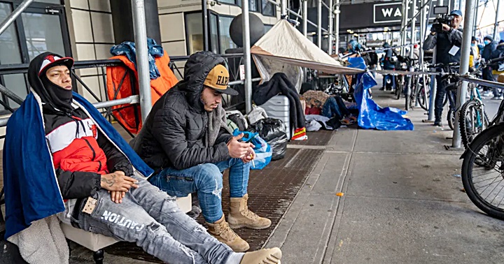 Inmigrantes venezolanos desalojados del hotel Watson acampan en la calle afuera del edificio como protest, en Nueva York (EEUU)EFE/Ángel Colmenares