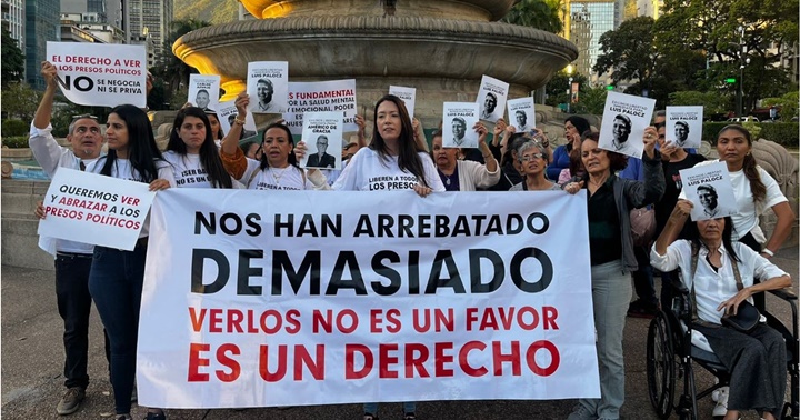 Un grupo de alrededor de 20 personas, que se concentró en la Plaza Francia de Altamira, llevó pancartas con mensajes como Verlos no es un favor, es un derecho y Queremos ver y abrazar a los presos políticos.