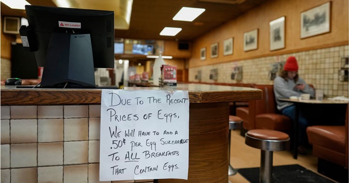 En el restaurante Pepper Pod, en Newport (Kentucky, EE UU) se puede leer un cartel que dice: Debido al reciente aumento del precio de los huevos, tendremos que añadir un recargo de 0,50 centavos por huevo a todos los desayunos que los contengan, el jueves 13 de febrero de 2025.