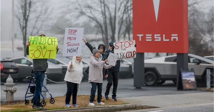 Las ventas de la compañía cayeron un 45% en Europa en enero y el malestar contra el hombre más rico del mundo se extiende por Estados Unidos. Una manifestación contra Elon Musk ante una tienda de la compañía en Decatur (Georgia).