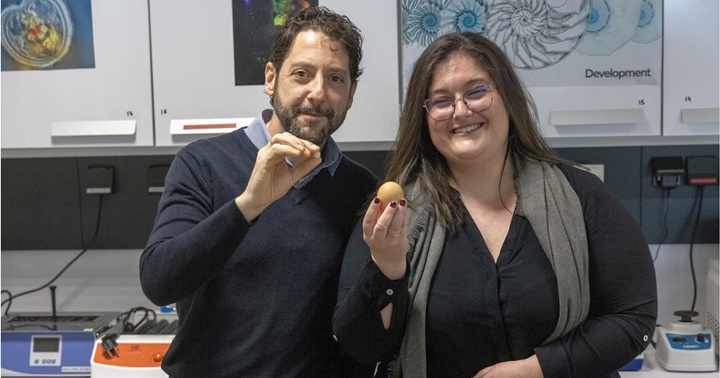 Tres estudios de las regiones cerebrales encargadas de procesar la información sensorial muestran que sus neuronas son y se comunican de forma diferente. El autor sénior de dos de los estudios, Fernando García, sostiene el huevo de un geco del que estudiaron su cerebro (a la izquierda). A la derecha, la primera autora de uno de los trabajos, Eneritz Rueda, con un huevo de gallina fecundado.