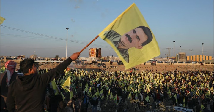 Kurdos sirios sostienen banderas mientras se reúnen después de que el líder militante encarcelado en Turquía, Abdullah Ocalan, pidiera el jueves a su Partido de los Trabajadores del Kurdistán (PKK) que depusiera las armas, una medida que podría poner fin a su conflicto de 40 años con Ankara y tener consecuencias políticas y de seguridad de gran alcance para la región, en Hasakah, Siria, 27 de febrero de 2025.