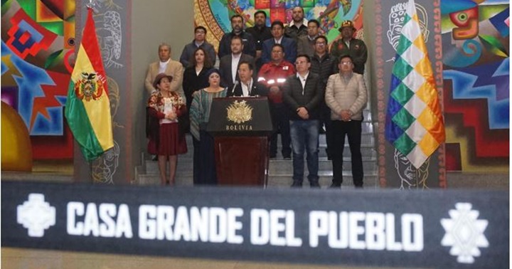 El presidente Luis Arce junto a su gabinete en conferencia de prensa.