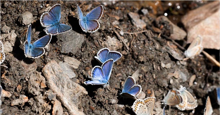 La mitad de los lepidópteros han desaparecido de varias zonas españolas y europeas mientras que en Estados Unidos han perdido casi la cuarta parte en lo que va de siglo. La niña esmaltada (‘Plebejus idas nevadensis’) es una mariposa propia de las praderas de montaña. En la imagen, varios machos y una hembra liban sales directamente del suelo de Sierra Nevada, en el verano de 2020.