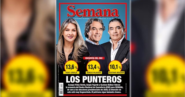 Vicky Dávila (13,6 por ciento) y Sergio Fajardo (13,4 por ciento) están hoy en empate técnico por el primer lugar en la intención de voto para las elecciones presidenciales de 2026, según los resultados de la más reciente encuesta del Centro Nacional de Consultoría (CNC) para SEMANA. En dicho estudio, Gustavo Bolívar aparece en el tercer lugar, con el 10,1 por ciento.