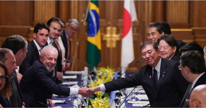 El primer ministro de Japón, Shigeru Ishiba, estrecha la mano del presidente de Brasil, Luiz Inacio Lula da Silva, durante una reunión celebrada en el Palacio Akasaka State Guest House en Tokio.