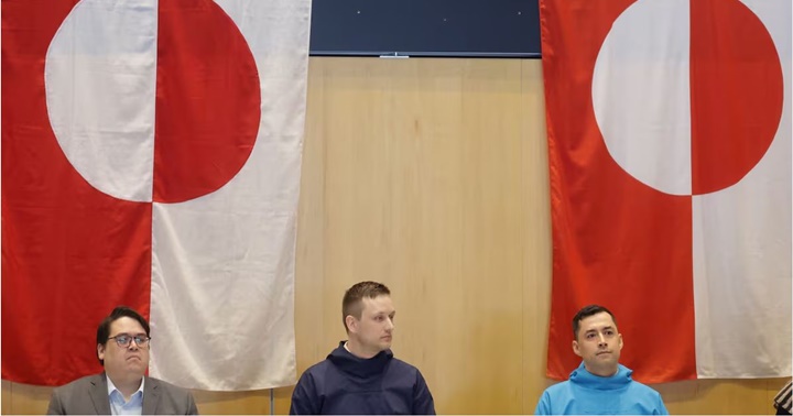 El futuro primer ministro groenlandés, Jens-Frederik Nielsen (Centro), anunciaba junto a sus futuros socios en la coalición el acuerdo para la formación de Gobierno, este viernes en Nuuk.