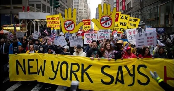 Los organizadores en New York convocaron la protesta bajo el lema “Manos fuera”. Participantes en las masivas protestas nacionales contra Trump y Musk, 5-4-2024.