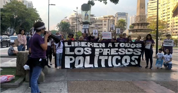 Los familiares protestaron en la plaza Altamira, en el este de la capital, exhibiendo pancartas para pedir la liberación de sus parientes y llevando globos morados, color que representa la preparación espiritual y la penitencia en la tradición católica.