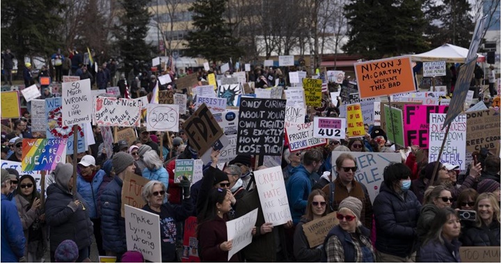 En el centro de Anchorage, Alaska, la multitud coreó consignas y ondeó pancartas para expresar su oposición a los recortes y despidos del Departamento de Eficiencia Gubernamental (DOGE), las deportaciones de inmigrantes y las políticas estadounidenses sobre Gaza.