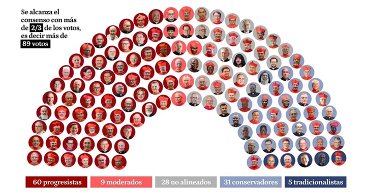 La Iglesia Católica tiene por delante una de las elecciones papales que más atención mundial acaparan, después de un Pontificado reformista que enfrenta a quienes quieren continuar con el legado de Francisco y quienes quieren revertirlo. 69 progresistas frente a 36 conservadores, y 28 no alineados.
