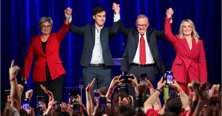 El primer ministro australiano, Anthony Albanese (Lentes), celebra con su pareja Jodie Haydon, su hijo Nathan y la ministra de Asuntos Exteriores, Penny Wong después de que los medios proyectaran la victoria del Partido Laborista.