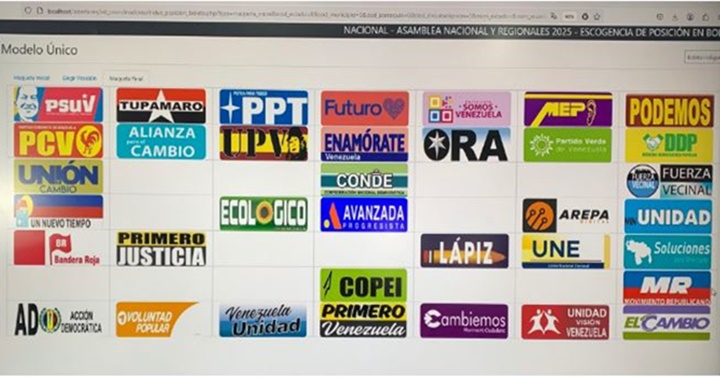 En abril, las 36 organizaciones de carácter nacional escogieron su posición en la boleta electoral en un acto privado. Por la imagen del tarjetón de votación y de ahí es que se supone cuáles partidos fueron admitidos para postular candidaturas a gobernadores, Consejos Legislativos y diputados a la Asamblea Nacional (AN).