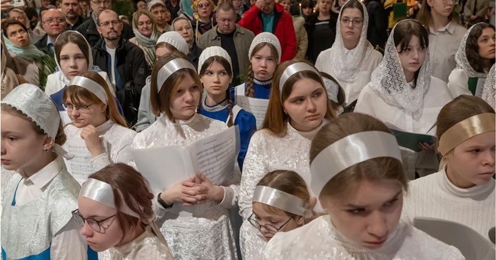 Niñas de un coro religioso participaban en un servicio de la Iglesia ortodoxa en San Petersburgo, Rusia.