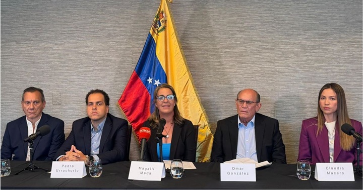 Los cinco dirigentes del comando de campaña de María Corina Machado, Magallí Meda, Pedro Urruchurtu, Claudia Macero, Humberto Villalobos y Omar González, ofrecieron este sábado su primera rueda de prensa en Washington, tras su rescate de la embajada de Argentina en Caracas, donde estuvieron forzosamente encerrados durante 412 días bajo asedio del régimen chavista.