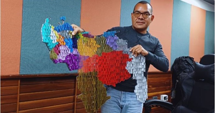 El artista plástico venezolano, Aureliano Parra, presentó su versión artística del Mapa de Venezuela en la obra «Sostenibilidad y el Reciclaje», la cual busca promover el cuidado del planeta.