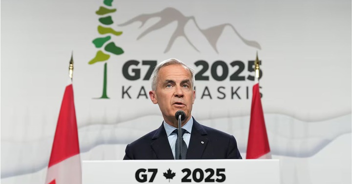 Deslucida por la crisis en Oriente Próximo y la marcha de Donald Trump. El primer ministro de Canadá, Mark Carney, en la rueda de prensa final de la cumbre del G-7 de junio 2025.