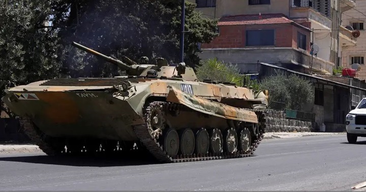 Tanque sirio escoltado por una camioneta policial en Sweida.